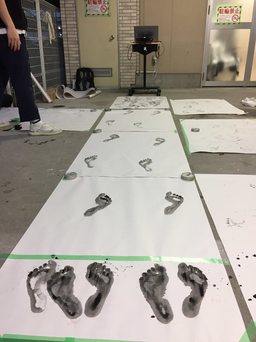 このロジックの検証は、バイオメカニクスに強い整形外科の先生方が協力してくださり、その検証結果は日本臨床バイオメカニクス学会の学会誌にも掲載されました。その検証とは、足の裏に墨汁を付けて紙の上を歩くのと同時に、ボディトラッキングと上記ロジックで取得した歩幅を比較するという原始的ですが確実な方法で行われました。もちろん当社のメンバーも足に墨汁を塗って歩きました。