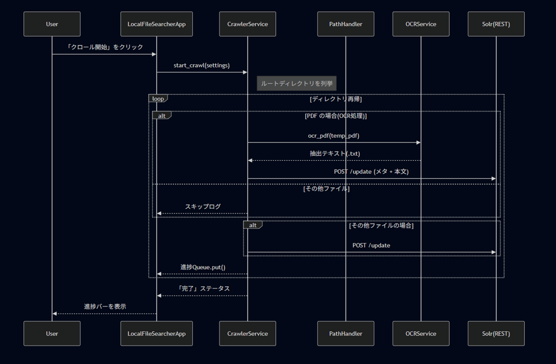 PDFのOCRには時間がかかるので、まずクロールが始まると指定されたフォルダ以下のPDFを全て探してOCRを行います。これは非同期処理で行っているのでそれと並行してその他ファイルをクロールします。全てのファイルのクロールが終了してPDFのOCRとSolrへの登録が終わった時点でユーザーが見ることのできる進捗バーが100%表示になり、完了を通知します。