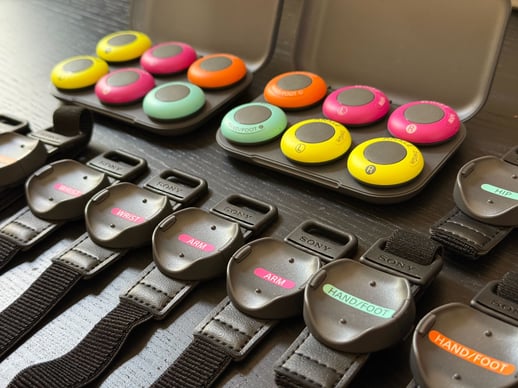 直径約3.2cm・重さ約8gの小型センサーを体の各部(頭・腰・手首・足首など)に装着し、スマホやPCと接続することで全身の動きをリアルタイムで3Dデータ化できます。