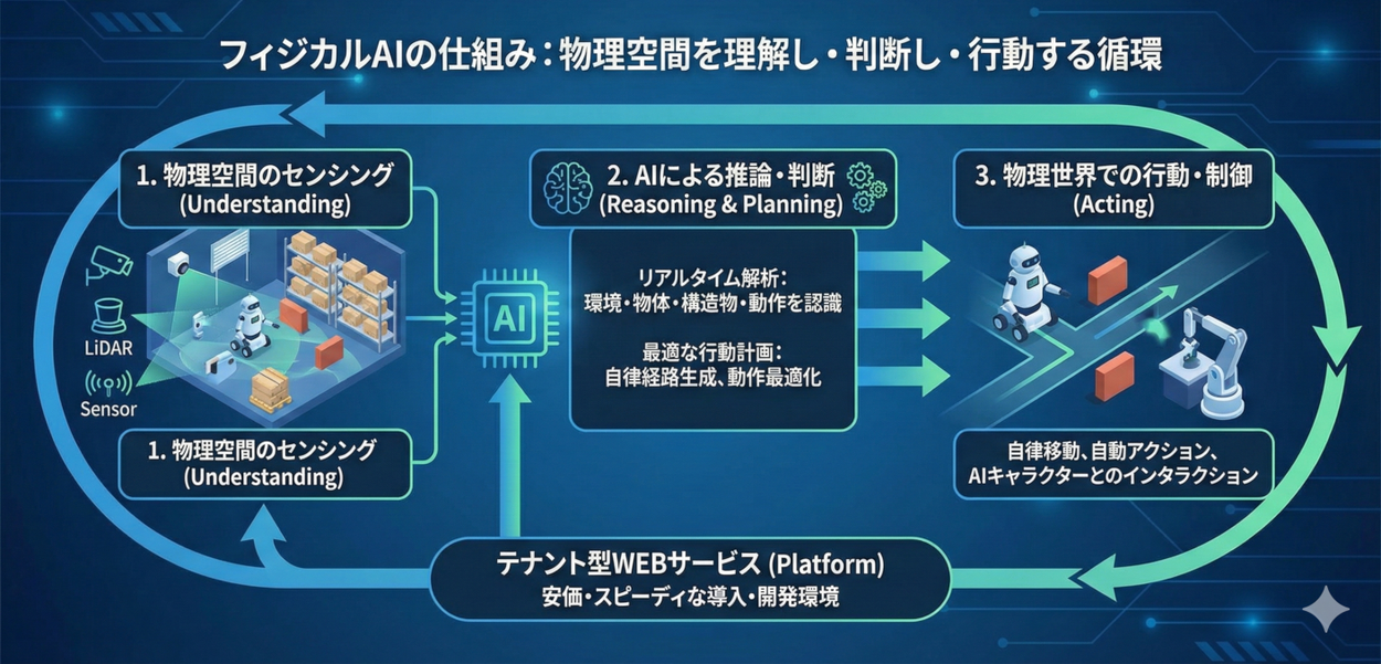 フィジカルAIは、AIによる推論とリアル空間のセンシング技術を組み合わせ、「環境・物体・構造物・動作」をリアルタイムに理解し、最適な行動や制御を行う自律型AI技術 です。